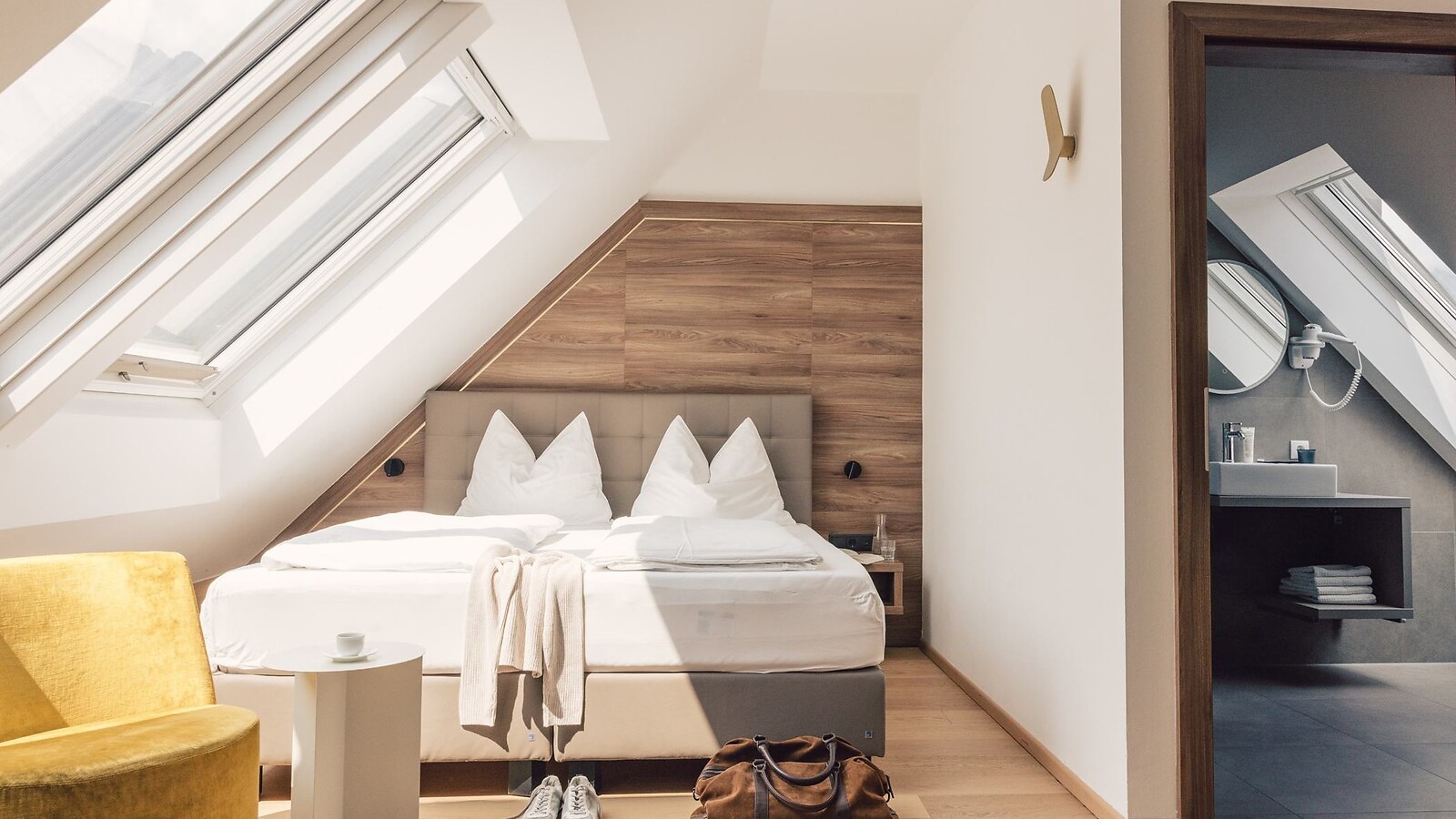 Ob alleine oder zu zweit, in unserem Panorama Apartment können Sie Ihren Aufenthalt in vollen Zügen genießen. Auf 30 qm finden Sie sowohl eine Kochnische, als auch ein gemütliches Doppelbett mit Dachfenster-Aussicht. Starten Sie mit Blick auf die Berge in den Tag!