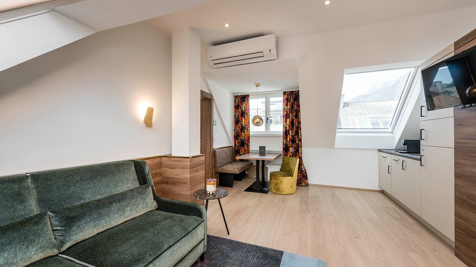 Auf 45 qm können Sie in trauter Zweisamkeit in 2 Zimmern die atemberaubende Aussicht auf die Nordkette genießen. Nehmen Sie Platz auf der gemütlichen Couch oder lassen Sie Ihrer kulinarischen Fantasie freien Lauf in unserer modernen Kochnische. Genießen Sie den morgendlichen Kaffee auf dem Balkon im ersten Sonnenschein und starten gut in den Tag.